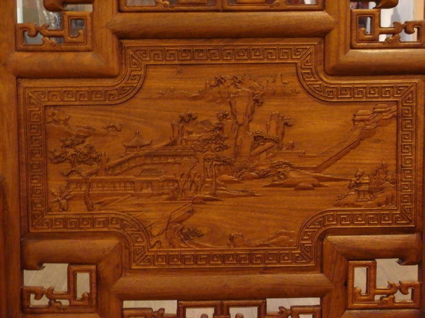 最后,再重點說說扶手內外兩側處的紋飾圖案部分,同樣如上方“松柏庭宇云海圖”給人的第一感覺一樣,該處畫案整體之風格偏重山水文人畫一類,依舊是挺拔筆直的松樹,閑庭屹立的庭宇,還有那可以倚照著波光漣漪的湖水,感受到的那悉簌搖擺的徐徐的微風,飄蕩在這靜怡的湖面之上。一座有著扶手的欄倚小橋駕于在湖面上,連接著湖岸兩端,幾處矮實的小戶瓦樓簇居而座,整體畫面給人一種“小橋流水人家”的彎延意境美,綿延厚絕。