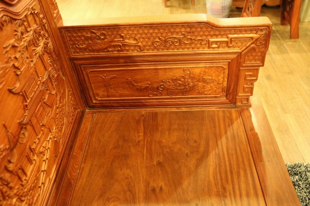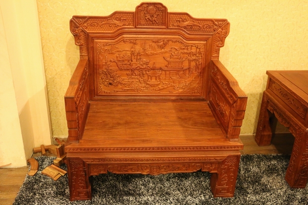 沙發(fā)的座椅面平整光滑,極盡原木材質(zhì)紋理之視覺感受;側面扶手處無任何鏤空面積之留飾,嚴實而框整,整體框架為矩形外觀設計。扶手上端正反兩面位置處,同樣雕繪有上處靠背板處鳳凰圖案形狀之紋飾,扶手底部正反兩面位置則雕繪有一些商周時期使用的器具,如斟酒器、編鐘等。