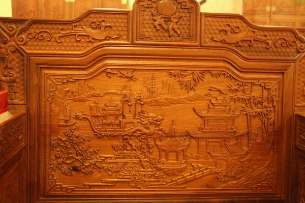 接下來,我們來看看沙發(fā)背靠板正面的主體部分,其畫案外部輪廓形狀呈現(xiàn)如一墨水瓶式形狀設計,上端較為扁實。內(nèi)部雕刻圖案展現(xiàn)得極為豐富艷麗,正如該款沙發(fā)名字所闡述的那樣——“漢宮春曉”,宛如一幅文人古畫卷中的景致,可以很清晰地看見:那波光漣漪的湖水載著亭臺綺立的龍舟,婉延而緩緩向前開來的景象,前段龍首處神情惟妙惟肖極為莊重而氣定神閑,畫案立于其主體的正中位置,顯得極為惹目和顯眼。在湖水岸邊,靠右端的湖岸上則是那茂密蔥郁的竹林,雖未能身處畫中,卻好似可以聽見,那一葉葉竹瓣隨著微風飄蕩,窸窣碎碎交相搖晃時所發(fā)出的聲響,頗顯幽靜而深遠。另在畫案后方的遠景處,除了稀疏而立的幾目草木郊野,還有一座頂天而豎的寶塔,遠遠眺望著,好似氣派風度。而在湖水的上方,還可以瞥見那兩只展翅高飛的仙鶴,它們乘風而列,自由翱翔時的自在景象,也為整體的畫卷添加了某種只有身處仙境神域時所能感受體會的到的意境神韻感受,另外仙鶴它也代表了長壽與富貴,它仙風道骨,為羽族之長,是為該幅富麗堂皇畫卷中的一處獨特景觀,妖嬈而鶴立。在整體圖案的其他位置,還雕繪有幾目莊嚴氣派矗于湖岸的亭臺樓倚,一尾身處龍舟后方悄悄而出的小帆舟,以及附著于畫卷中央下方位置處,飄縷浮動緩緩而延的祥云…
