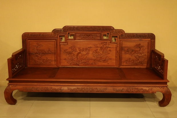 沙發(fā)的其他各處細節(jié)。其座椅面,平整略帶淡雅的原木光澤,顯得十分地古典清秀,清新而自然。沙發(fā)的四處椅角設(shè)計則比較有特色,非一般沙發(fā)筆直或稍顯圓潤的直線型豎直設(shè)計,其風格有些像動物的犄角,彎曲而延伸,安然優(yōu)雅而簇立,顯得地十分溫婉可掬,驚艷動人,就如同那華貴的牡丹,艷壓在那群芳之中,清新而脫俗。而椅座面下方與椅腳相連的幾段木橫處,同樣飾繪有牡丹的圖案紋飾,并且在其左右兩端各串有幾銜銅錢,隱含著“滾滾財源”“富貴吉祥”的寓意。