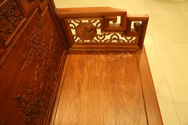 沙發(fā)兩處的扶手,扶手憑欄倚相擁而靠,上處雕繪有幾幕鏤空的紋飾,紋飾呈心型圖案設(shè)計,典雅而又富含時代氣息,而各紋飾間另夾帶一圓“福”字的雕刻圖案,總體寄托了“心心相印”“和諧美滿”“福氣安康”“幸福吉祥”的美好寓意。