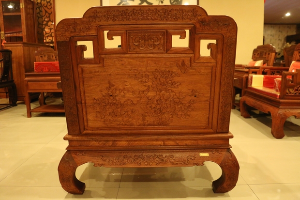 至上而下,一木呈“凸”字形式樣形狀的木板橫架于沙發(fā)靠背最上部的左右兩端,“凸”字上邊中間“幾”字形部分則設(shè)計的較為圓潤扁長,長度約占背板的五分之三。在木板的正背面兩處則均雕繪有一環(huán)串聯(lián)著的牡丹花紋飾,顯得極為秀雅端莊,古典奢華,花意柔存。