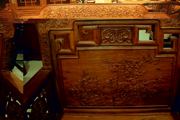 靠背板處最下方的位置,同樣是和最上端木板一樣,木板的形狀呈“凸”字形式樣設(shè)計,左右較之寬長,上方“幾”字形部分則較為扁實。其板面的正反兩邊均繪有一幅景致優(yōu)美,生氣秀麗的花鳥云彩圖,可以看見:那兩只飛舞躍動的小鳥正在花團錦簇的牡丹群里嬉戲玩耍,一只正準備躍起高飛振翅翱翔飛離花海,而另外一只則靜靜恰好簇立停留在了枝頭,打算收回雙翅凝首回望,濃情注視著對方,深情而依偎…花海的上方還雕繪有一輪明媚的驕陽,倚靠著云彩,浮影略現(xiàn),雋秀唯美。整體畫案給人一種花香鳥語的意境美,而那醉人驚艷的牡丹海,正映示了該系列沙發(fā)“國色天香”的這一主題,牡丹高貴典雅的氣質(zhì)以及姹紫嫣紅的花色,也蘊帶了雍容大度,吉祥富貴,典雅祥和之寓意,它是美的化身,也有純潔與愛情的象征意義。