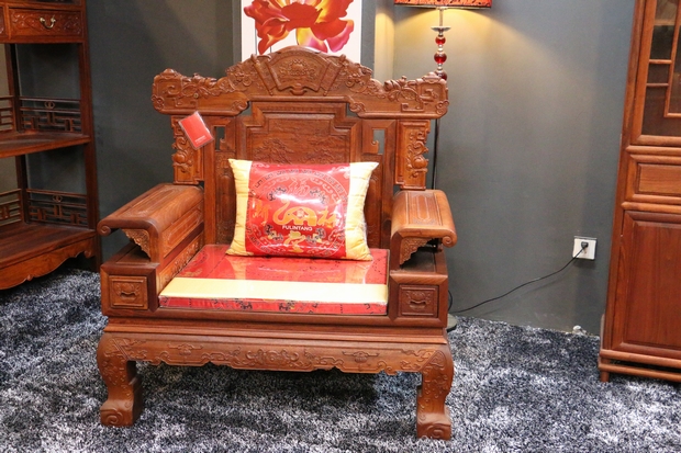 再往上,扶手處下端的前方位置均還外設有一小框格之抽屜,方便亦實用;而框格的上方則是兩處設計為鏤空式的長框格扶手,扶手左右的末端均以卷曲收尾,秀氣端莊圓潤舒適,而鏤空內則是以兩顆壽桃作為承托雕刻,形象意寓生動。另在實用性方面,該系列的沙發也借鑒了現代沙發座椅中軟綿舒適的使用特點,在座面上以及靠背板處還添備有一席軟墊以及靠背枕作為置換,根據環境需要以及個人使用習慣特點進行選擇性添置或撤換,十分方便。