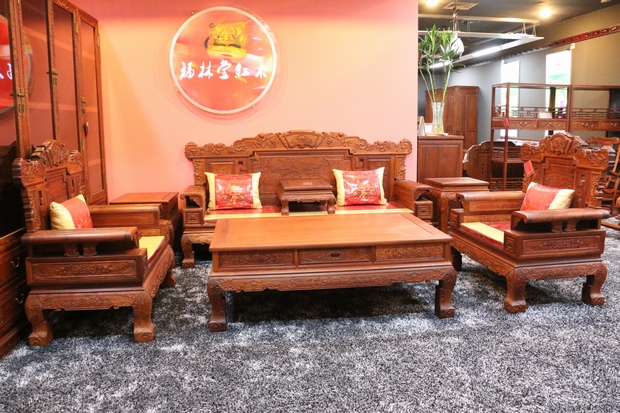 一件家具,根據每個人的需求或者審美的不同,有的人喜歡簡單實用的,而有的則喜歡華貴富美的一類,而今天我們福林堂紅木要為大家介紹的這一款沙發——富貴祥和紅木家具沙發,即是這樣一款以宮廷建筑的室內裝飾設計為藝術風格,造型講究堆成,色彩講究對比,雕刻鐫秀華美,外觀典雅富麗,十分氣勢恢宏的一款中式古典沙發。